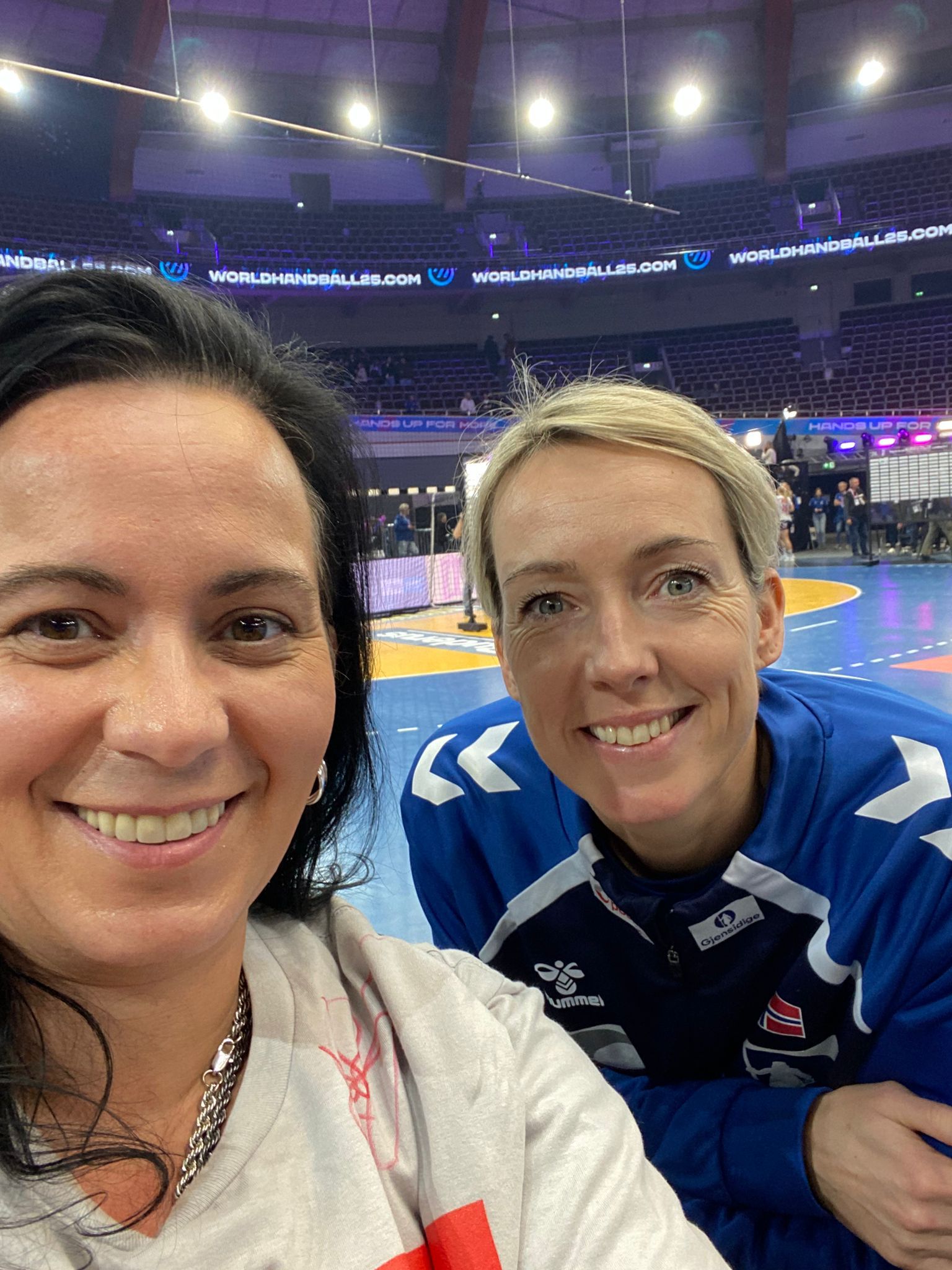 Und hier noch ein Gruß und ein schönes Erinnerungsfoto aus Dortmund. Unsere Schiedsrichterin Nadine Behling mit strahlenden Augen mitten drin. Ganz nah am Spielfeld mit der Weltklasse Torhüterin Norwegens, Katrine Lunde.