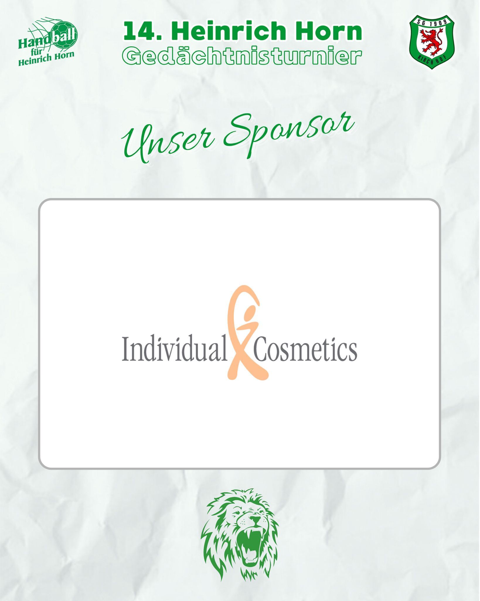 Wir freuen uns, Individual Cosmetics als Sponsor des Heinrich Horn Gedächtnisturniers begrüßen zu dürfen. Das Unternehmen mit Sitz in Knüllwald-Remsfeld steht für hochwertige Kosmetik „Made in Germany“ – mit dem Fokus auf individuelle Pflege, wirkungsvolle Inhaltsstoffe und nachhaltige Rezepturen. Als Partner für die professionelle Kosmetikbranche verbindet Individual Cosmetics höchste Ansprüche mit echter Leidenschaft für Qualität. Werte, die auch im Sport zählen – und die unser Turnier umso mehr bereichern. Vielen Dank für die Unterstützung!