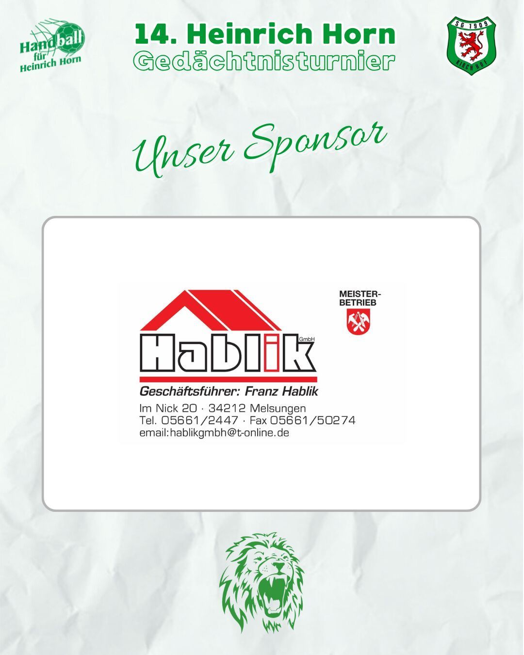 Wir freuen uns über die Unterstützung der Hablik GmbH als Sponsor des 14. Heinrich Horn Gedächtnisturniers. Als regional verwurzelter Meisterbetrieb steht das Unternehmen seit vielen Jahren für zuverlässige Handwerksqualität im Bereich Bau und Sanierung. Ob Dach, Wand oder Innenausbau – die Hablik GmbH verbindet Fachwissen, Erfahrung und ehrliches Handwerk mit dem Anspruch, jeden Auftrag professionell und termingerecht umzusetzen. Ein starkes Team für starke Projekte – und ein starker Partner für unseren Sport!