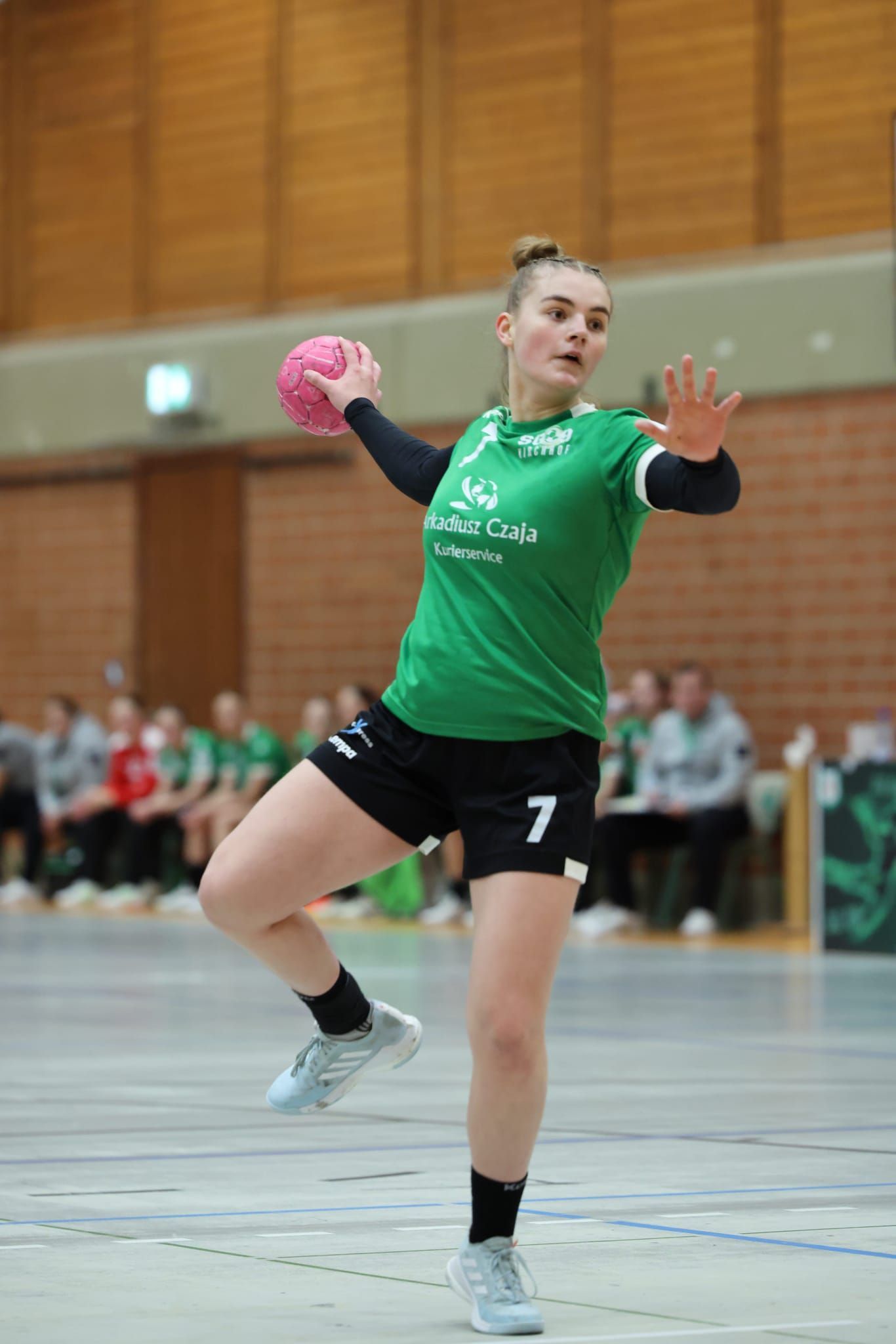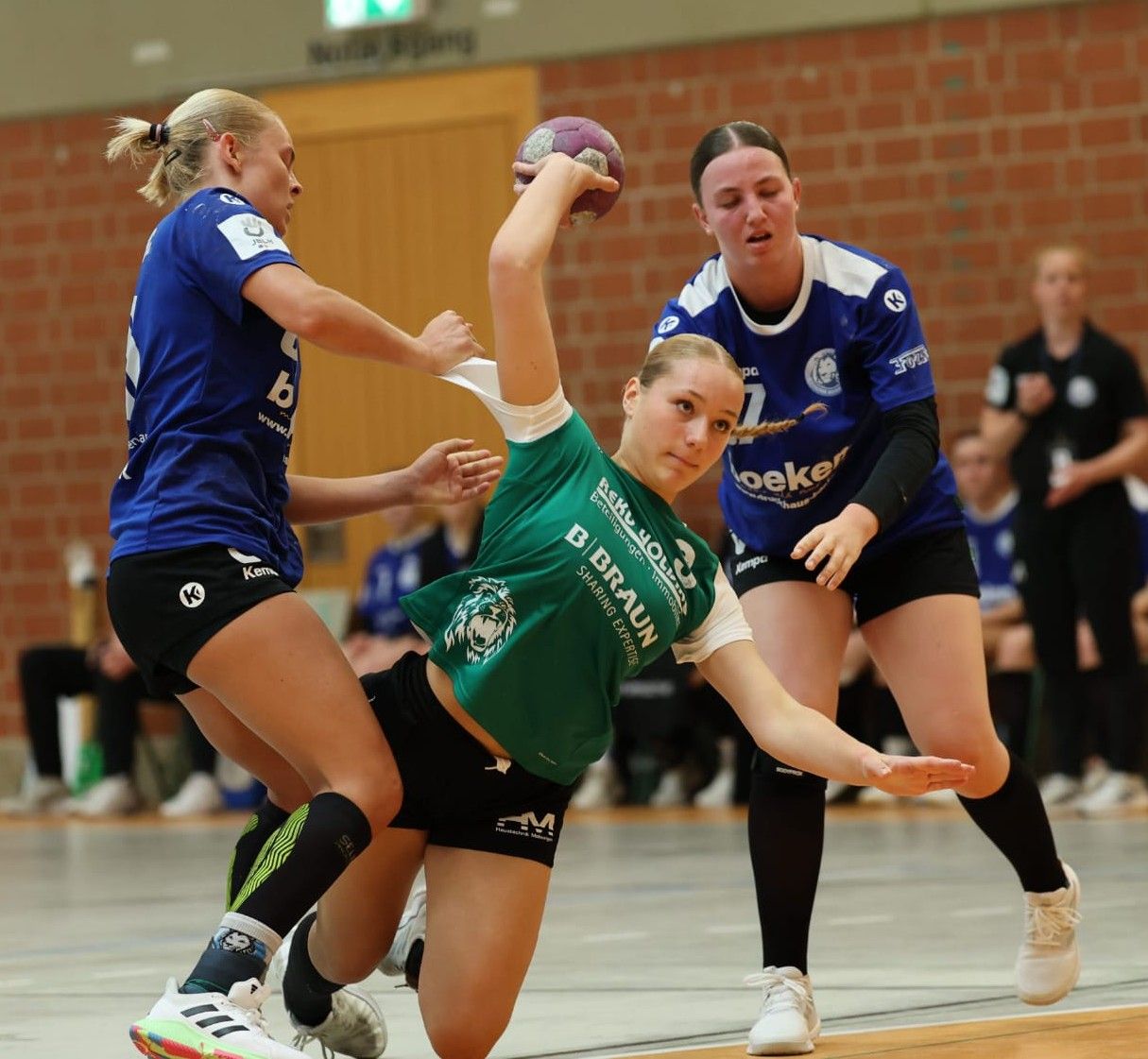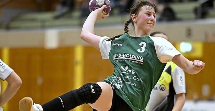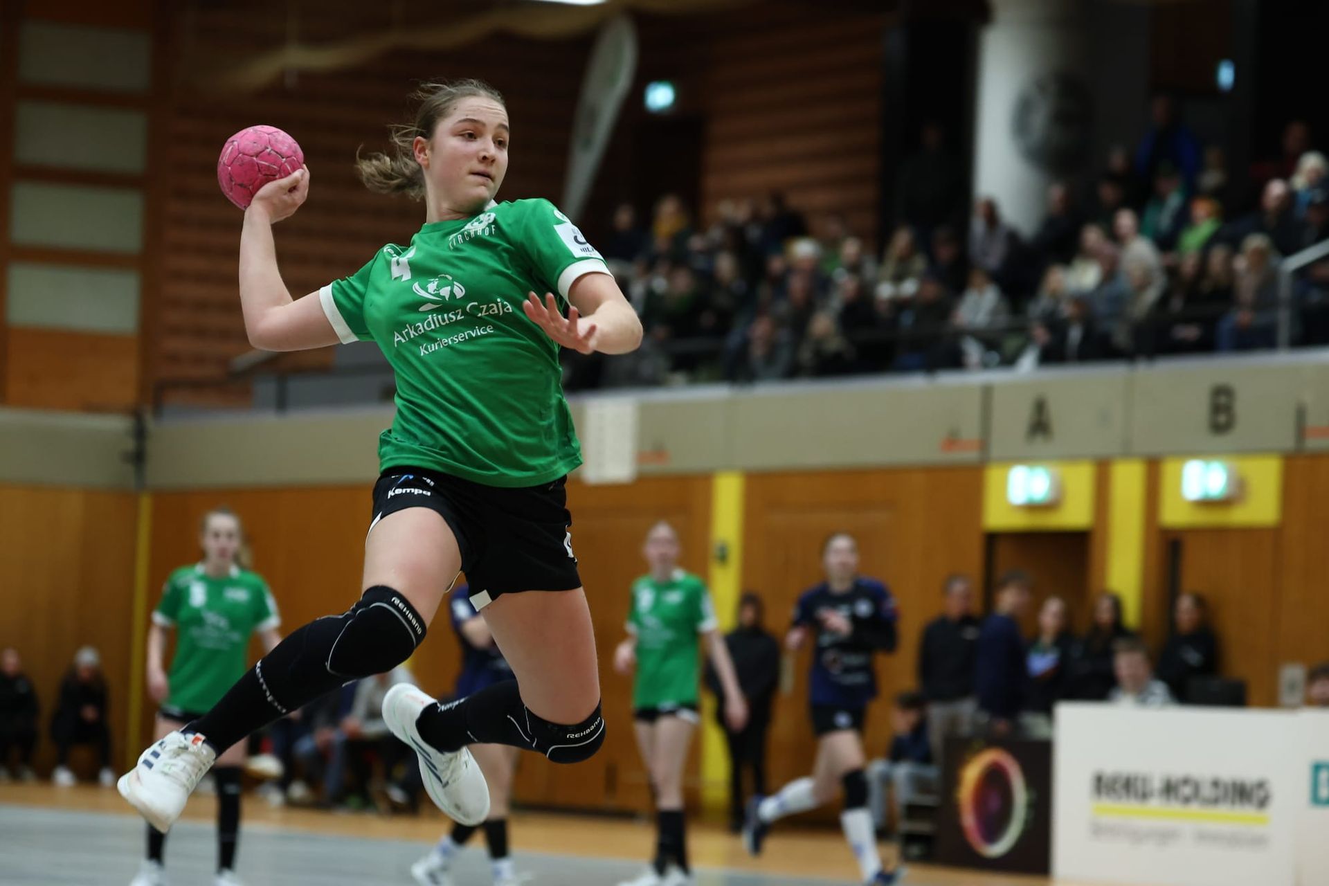Melsungen – „Mit dem ersten Angriff hat sich die Nervosität gelegt. Jede wusste, was zu tun ist, und wir haben unsere Emotionen gezeigt“, sagte Emilia Damm. Die 15-Jährige war neben Rechtsaußen Helen Sonntag und Rückraumspielerin Helena Wagner eine von drei Spielerinnen aus dem Jahrgang 2009, die in der Stammsieben glänzten. Drei B-Jugendliche, die den bis zu drei Jahren älteren Gästen im Eiltempo Grenzen aufzeigten.