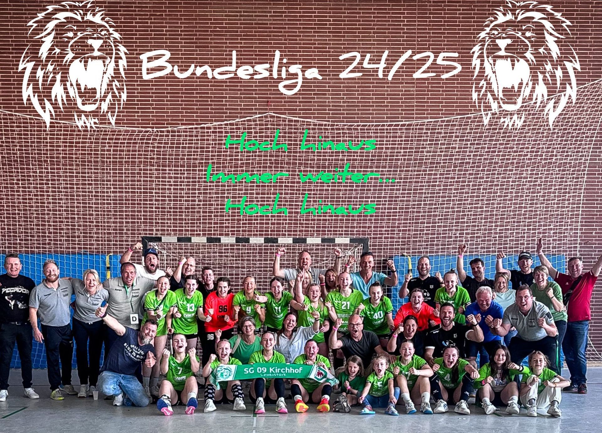 Hoch hinaus, immer, immer weiter, hoch hinaus, dieses Lied begleitet die Handball-Mädels der SG 09 Kirchhof und mit diesem Lied von Tim Bendzko haben sie nach der Marathonsaison 2023/2024 in der Schwarzbachhalle in Kriftel ihren Doppelaufstieg in die Bundesliga ausgelassen gefeiert. Der Lied-Text passt im Effeff zu den Kirchhof-Mädels. Sie gehen Extrameter, sie laufen unzählige Steigerungsläufe während ihrer 151 intensiven Trainingseinheiten in der abgelaufenen Saison. Fehler prägen sie: mach mehr! Auch dieser Satz ist treffend. „Und wenn ich glaube, meine Beine sind so schwer, dann gehe ich nochmal tausend Schritte mehr... Ja, die Beine, unsere Beine sind schnell, unsere Beine leisten viel“.