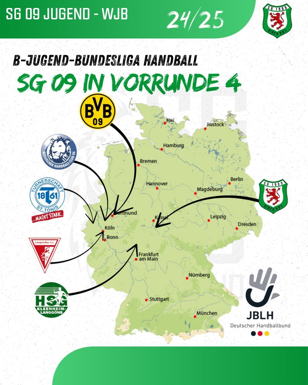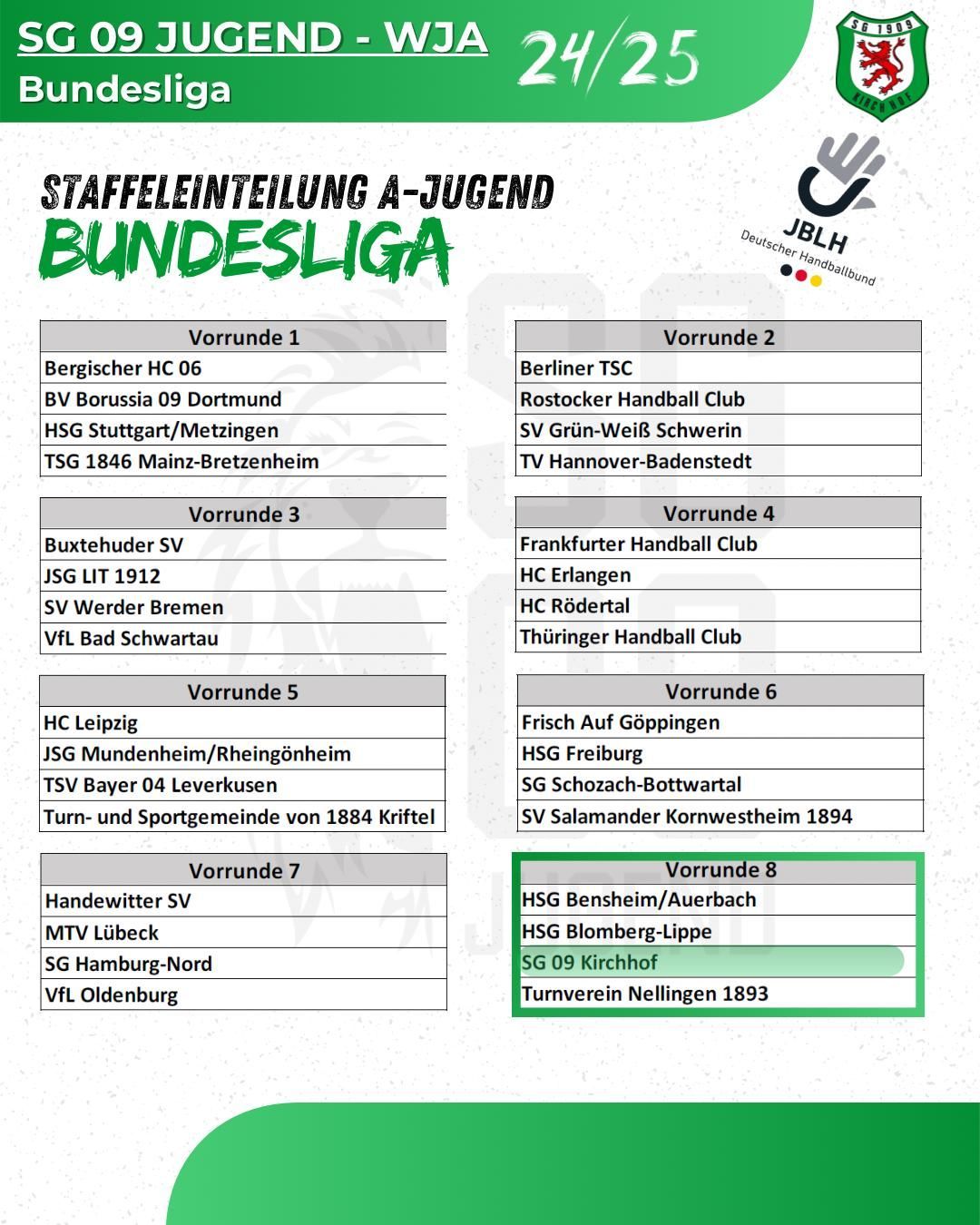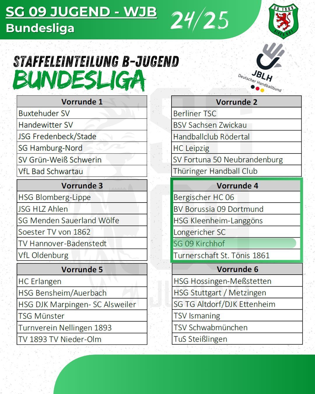 Kirchhofs B-Jugend startet in einer von sechs Vorrundengruppen mit fünf Mitstreitern in die Bundesliga. Gegner sind der Bergische HC, BV Borussia Dortmund, HSG Kleenheim-Langgöns, Longericher SC und der TS St. Tönis.