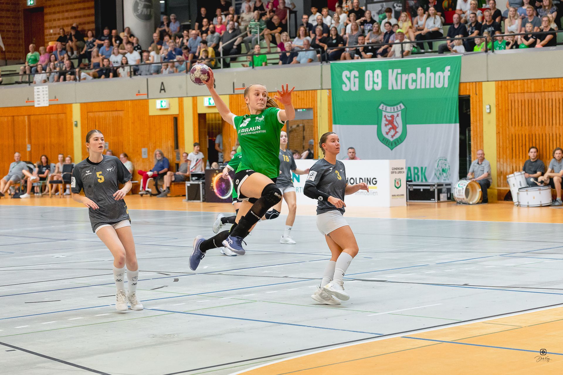 SG 09 Kirchhof – BV Borussia Dortmund 31:34 (18:17). „Da war mehr drin. Im Angriff haben wir in der ersten Halbzeit sehr gut gespielt, dann aber zu viele leichte Tore von Dortmund zugelassen“, sagte Lena Hillenbrand. Dabei erwischte Kirchhofs durchsetzungsstarke Rückraumspielerin mit ihrem Team den besseren Start (4., 4:1), blieb bis zum 8:6 (12.) vorn, bevor ein offener Schlagabtausch mit wechselnden Führungen folgte. Die Gastgeberinnen münzten dabei einen 12:14-Rückstand (23.) in eine Drei-Tore-Führung (27., 17:14) um. Das hatte zur Folge, dass BVB-Trainerin Anne Müller ihre Abwehr zurückbeorderte, als 6:0-Verbund ausrichtete. Eine Maßnahme, die Früchte trug, denn Kirchhof mühte sich, musste erstmals auf drei Tore (36., 20:23) abreißen lassen. Helen Sonntag gelang beim 25:26 (45.) letztmals der Anschluss, bevor die Gäste mit ihrer Sonderbewachung gegen Spielmacherin Helena Wagner den SG-Motor endgültig ins Stottern brachten.