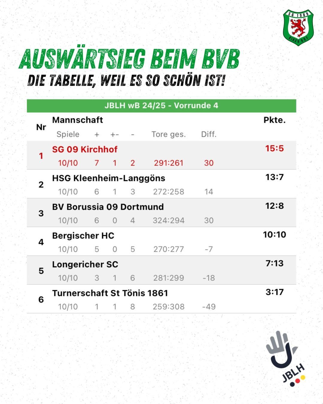 Longericher SC - SG 09 Kirchhof 32:32 (20:15). Eine starke Aufholjagd bescherte der SG 09 noch einen Punkt. Dank eines Dreierpacks durch die unermüdlichen Helena Wagner (2) und Meriam Grün gelang sogar die Wende zum 32:31, ehe die Gastgeberinnen 38 Sekunden vor Schluss noch ausglichen.