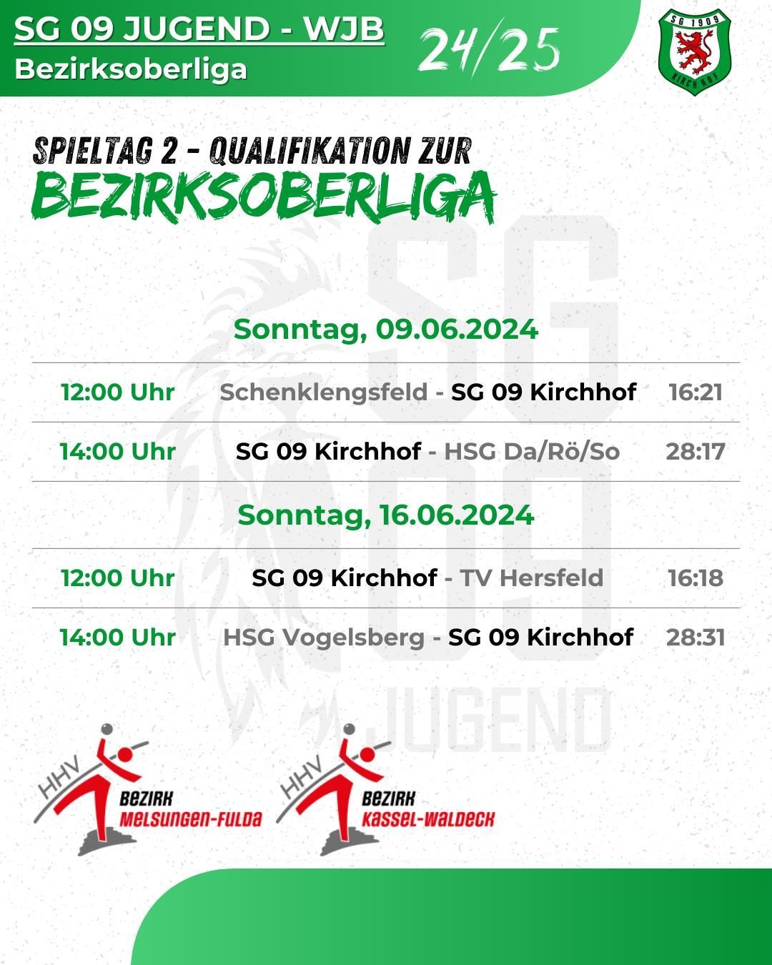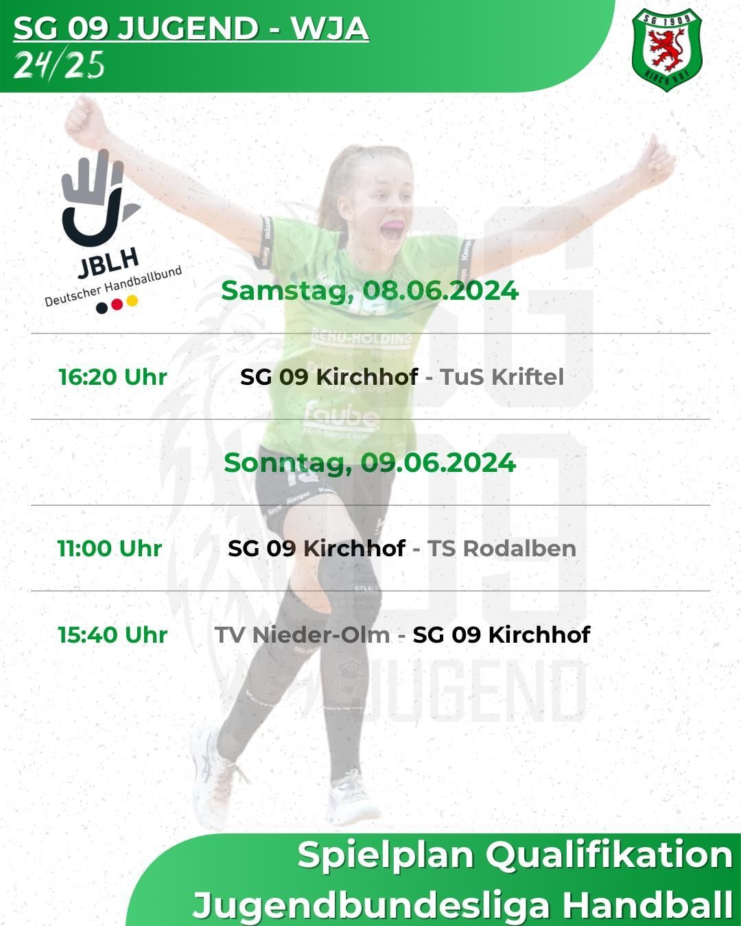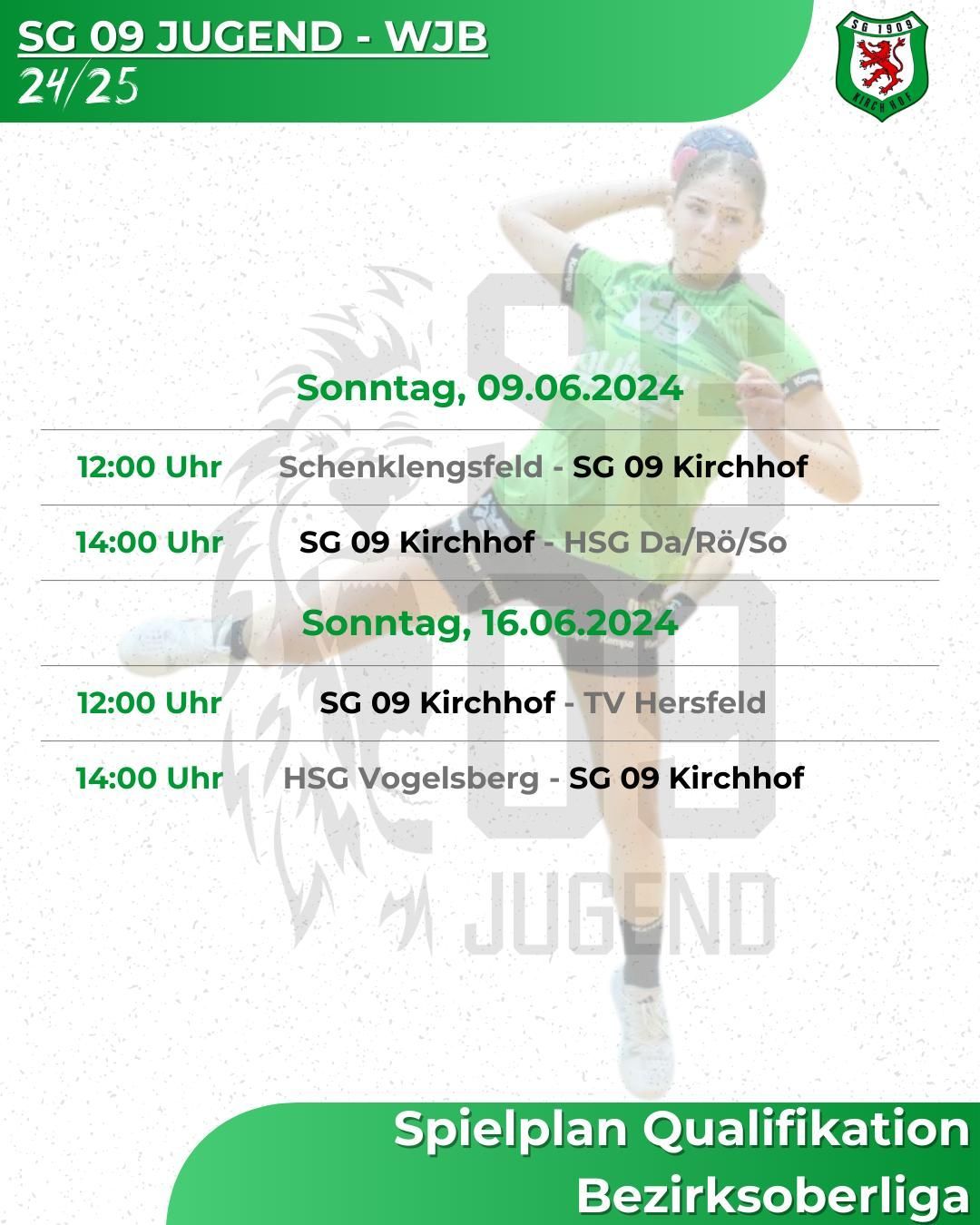 Die SG 09 Kirchhof setzte sich souverän gegen die HSG V. Vogelsberg mit 11:5 durch, musste sich aber danach sowohl gegen den TV Hersfeld mit 9:15 als auch gegen den SV Reichensachsen mit 7:11 geschlagen geben. Beste Werferinnen für die Kirchhöferinnen waren bei diesem Qualifiaktionsturnier Anni Schmidt (6), Meriam Grün (5) und Emilia Damm (4). Weiterhin trafen: Schäfer 3, Grösch 3, Wagner 2, Döring 1, Martinez-Schanze 1, Wettig 1, Garde 1.