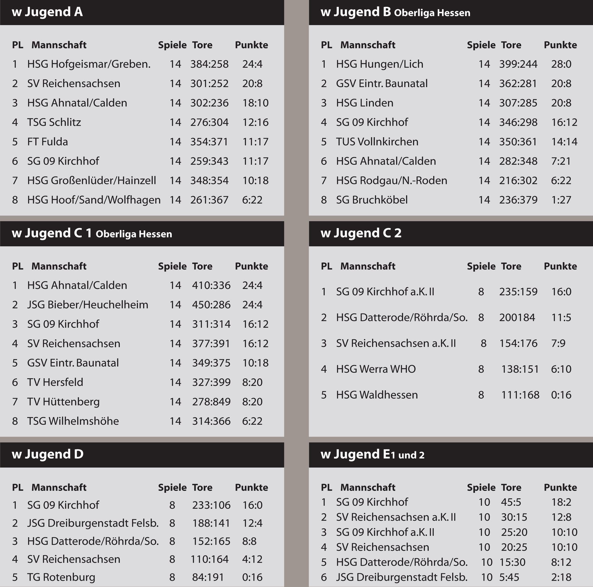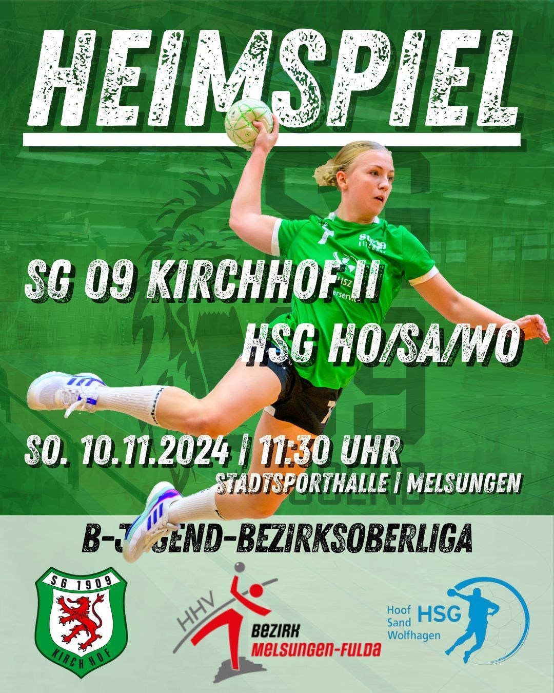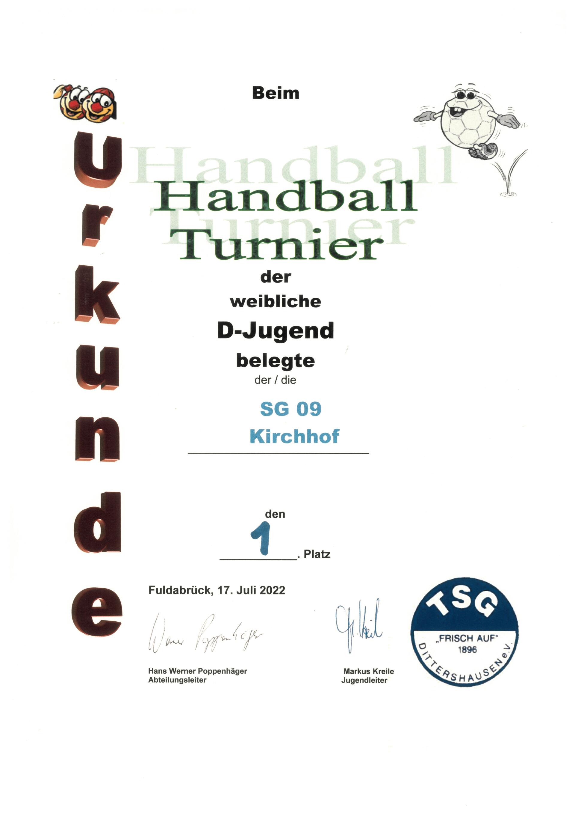 Die SG 09 Kirchhof setzte sich souverän gegen die HSG V. Vogelsberg mit 11:5 durch, musste sich aber danach sowohl gegen den TV Hersfeld mit 9:15 als auch gegen den SV Reichensachsen mit 7:11 geschlagen geben. Beste Werferinnen für die Kirchhöferinnen waren bei diesem Qualifiaktionsturnier Anni Schmidt (6), Meriam Grün (5) und Emilia Damm (4). Weiterhin trafen: Schäfer 3, Grösch 3, Wagner 2, Döring 1, Martinez-Schanze 1, Wettig 1, Garde 1.