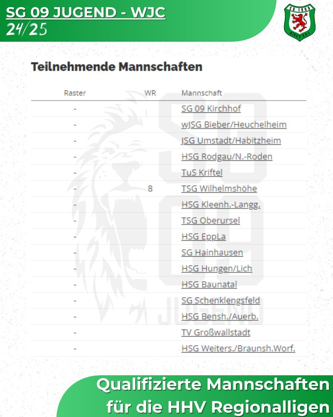 Mit zwei souveränen Siegen, 20:12 gegen den TV Hersfeld und 24:5 gegen FT Fulda, hat sich die SG 09 Kirchhof mit ihrer neuen w Jugend B für die Oberliga qualifizieren können. Das Team wird von Christian Denk trainiert und die Betreueraufgaben übernehmen Stefanie und Andreas Knoth.