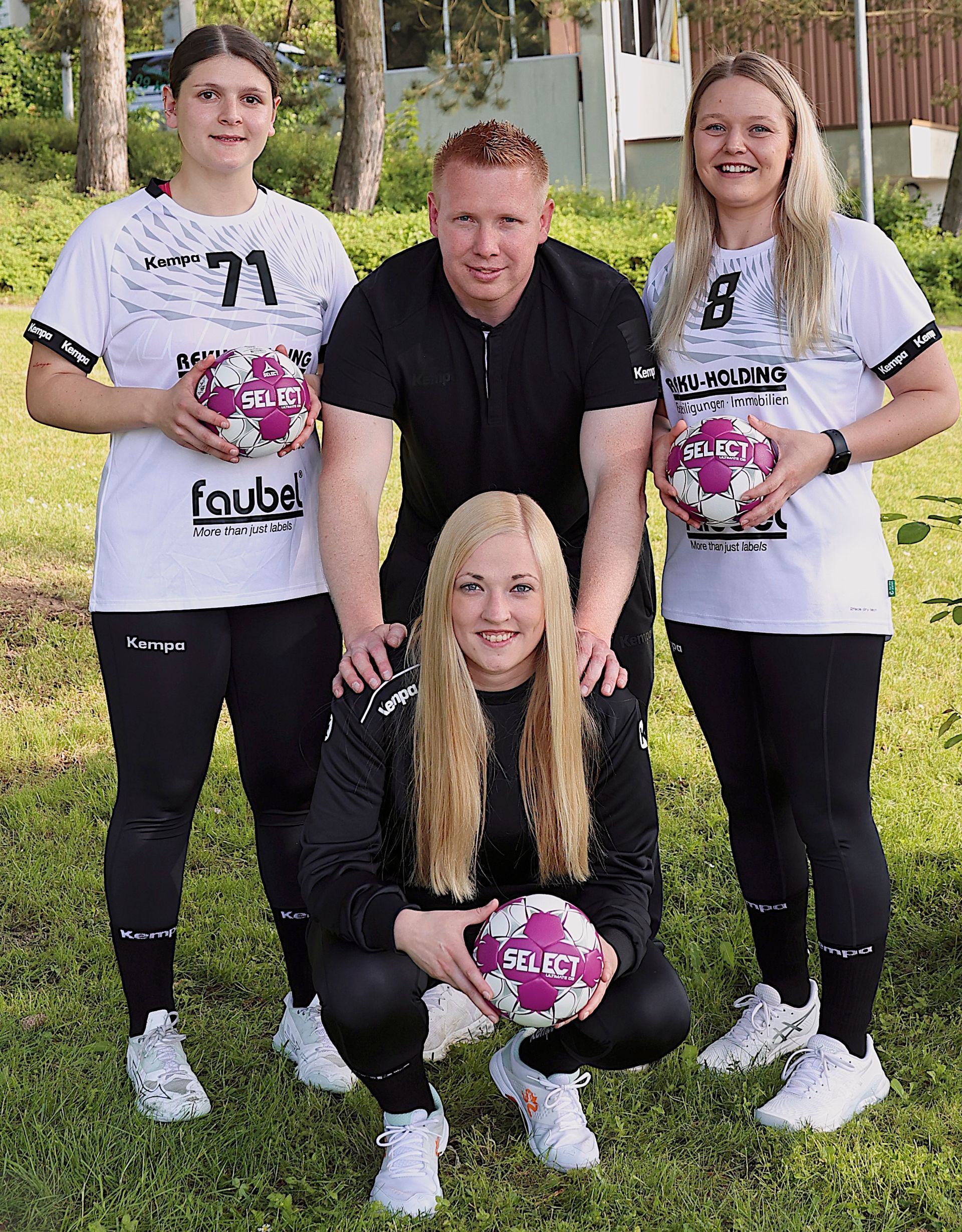 Im Bild von links nach rechts: Kreisläuferin Konstantina Kasartzoglou (kommend von der HSG Weiterstadt/Wörfelden/Braunsh.), SG-Trainer Martin Denk, Rückraumspielerin Michelle Horn, Torfrau Laura Eimer (beide kommend von der TG Rotenburg).